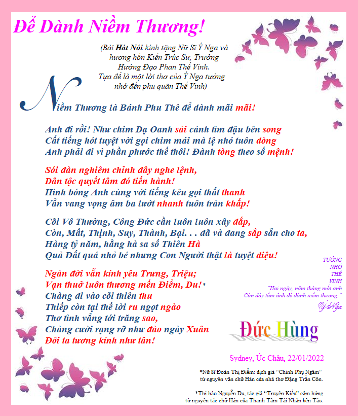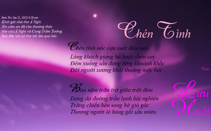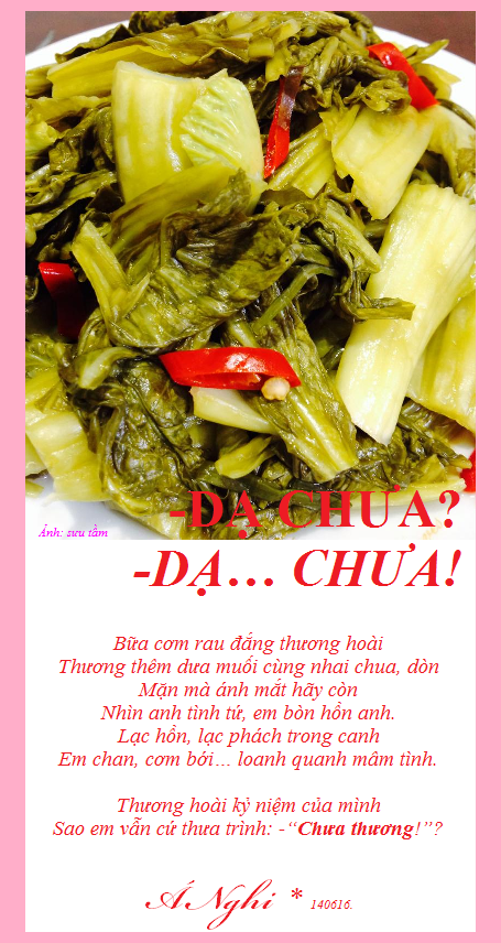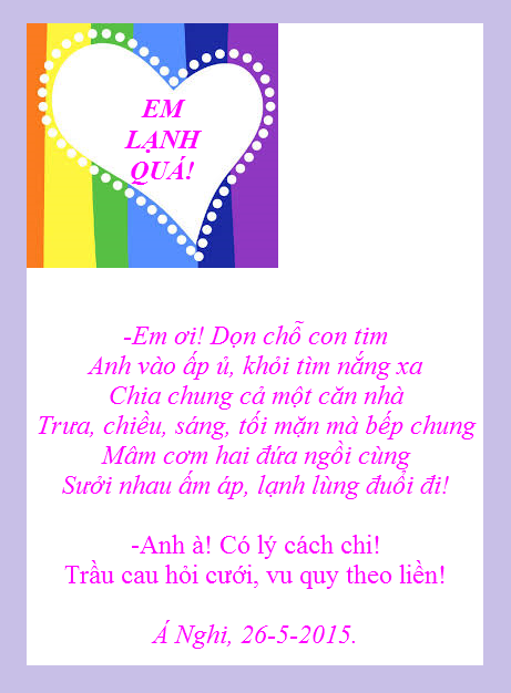 HOA VÀNG ĐÓN TẾTDần trôi tháng Chạp rồi nha!Anh ra đón nắng tỉa hoa cho giùmSao cho hoa nở từng chùmĐầu năm Mẹ cúng: đẹp, thơm Xuân này.Em xong bánh tét, gừng cay,Thịt kho, dưa giá, bánh chay, xôi, chè…Cờ thêu Vàng rực nữa nè!Anh treo cho khéo, mình khoe hòa bình.*-Em khoe: bánh mứt linh đình,Hoa thơm Mẹ cúng, xinh xinh cờ vàngNhờ em nhắc nhở rộn ràng!Năm tàn Tết đến cả làng đón Xuân.Nhà nhà góp sức dân, quânViệt Nam khai hội, sáng dần quê hương.Á Nghi và Anh, 9-2-2015.TÌNH XUÂN[3]Dưới nắng vàng… vàng… rựcEm trồm trộm nhìn anhChen lá nỏn xanh xanh,Hoa lục bình tim tím.Anh hỏi: -Nhận tình không?Tim em đập phập phồng,Gió xuân sao mà nóng?Em cứ nhìn… ra sông.Vội vàng chi thưa thỉnh.Hoa khen hai đứa mình,Chuồn chuồn vờn đủng đỉnhTô xinh một mối tình.Mình tìm tránh đám đôngKhoe xuyến trắng, lụa rồngÁo dài em lay động…“Dạ!” cho xuân thêm hồng.Á Nghi, 6-2-2015ANH ƠI MAI HÉ NỤ RỒI!Trông anh: đếm phút, xem giờVào, ra cũng nhớ. Đợi chờ: đếm giây!Người đi đó, có nhớ Đây?Hoa mai hé nụ, Xuân này về không?Á Nghi, 6-2-2015THƯA CHƯA MÀ ĐÒI LÌ XÌ?Mang vẽ ngoài lãng tửCùng giọng nói dịu êmThành thật không mà thửTập tành: “Anh thương em”?Cành mai vàng xóm trên,Cụm đào khoe xóm dướiBiết mặt chưa biết tênĐòi hoành phi, câu đối?Cá dưới sông mới lên?Chưa thân mà sao vội?Đó nhớ, mà Đây quênTìm sung hay cành vối?Khó lên nhưng dễ xuốngCoi chừng tròn mà vuôngGóc nào ruộng cũng nhọnGieo rồi, cấy có suông?Biết chèo xuồng, chèo gheThì mau về dạm hỏiTết muốn lì xì, khoe?Trầu cau: mau thì kịp!Á Nghi, 6-2-2015EM CỦA SÀI GÒNKhông sàng lọc già non, không lựa chọnDưới mặt trời em xinh tựa trăng trònMôi duyên son, em đẹp nhất Sài GònAnh đang tỉnh mà say say mới lạ!Lính không biết đến trời trăng chi cả!Dưới trăng đêm em rực rỡ mặt trờiThương thương ơi! Em mật ngọt cuộc đờiSinh khí mới gọi mời cả thế giới.Tới ngày hẹn, hàng hiên em đứng đợiChỉ mỉm cười mà phơi phới hồn tôiThương thương ôi! Em: sự sống đâm chồiChân bối rối, tưng bừng tim trẩy hội!Á Nghi, 25-12-2014https://www.facebook.com/YNGACANADA/